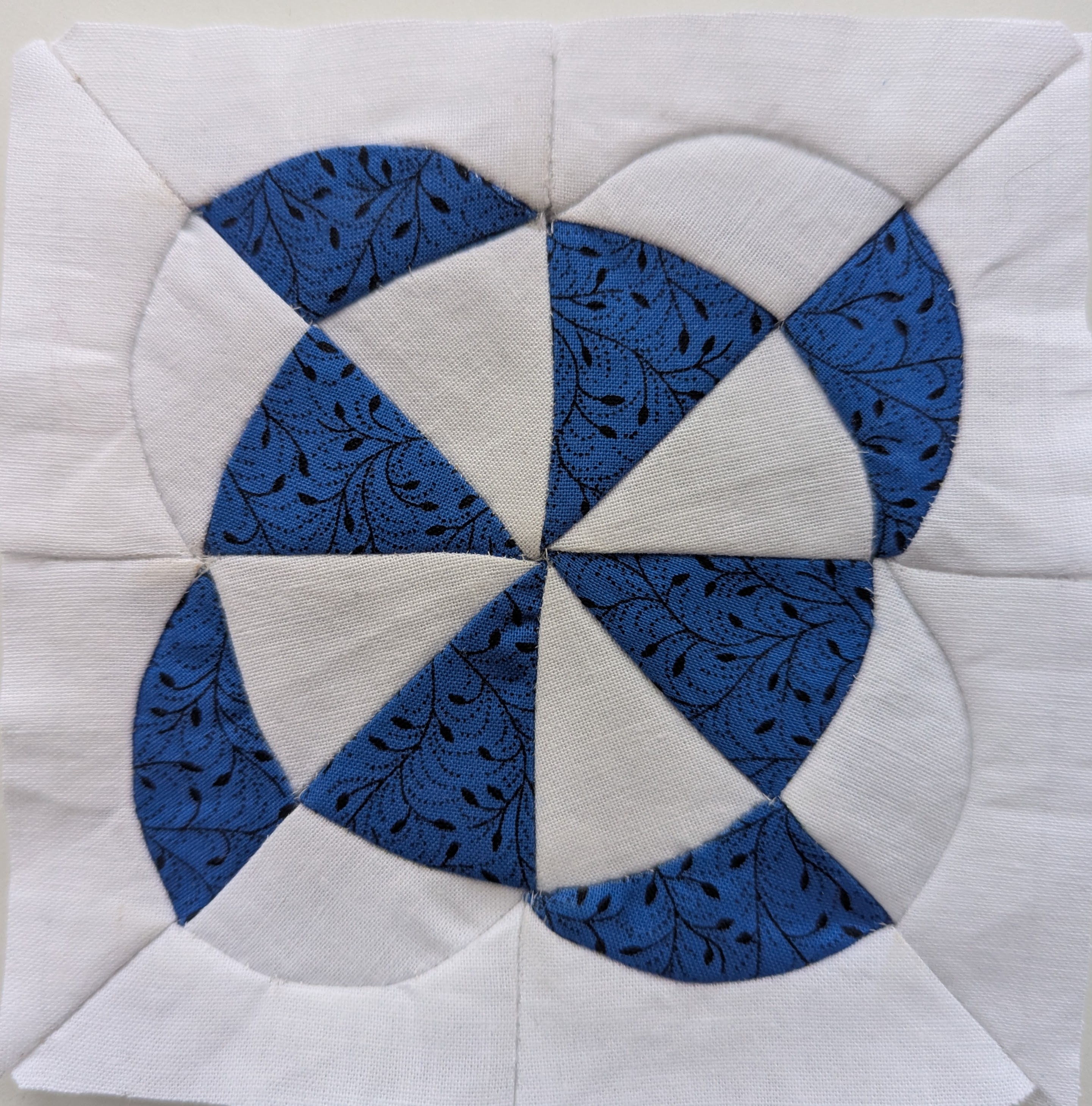 This block took me several days to complete. It is the first block that is entirely hand-pieced. I could not figure out another way to manage the curves, in such short runs, so handwork was the solution. I inadvertently mirrored many of the pieces, and had to cut out more fabric than anticipated to complete the block.
