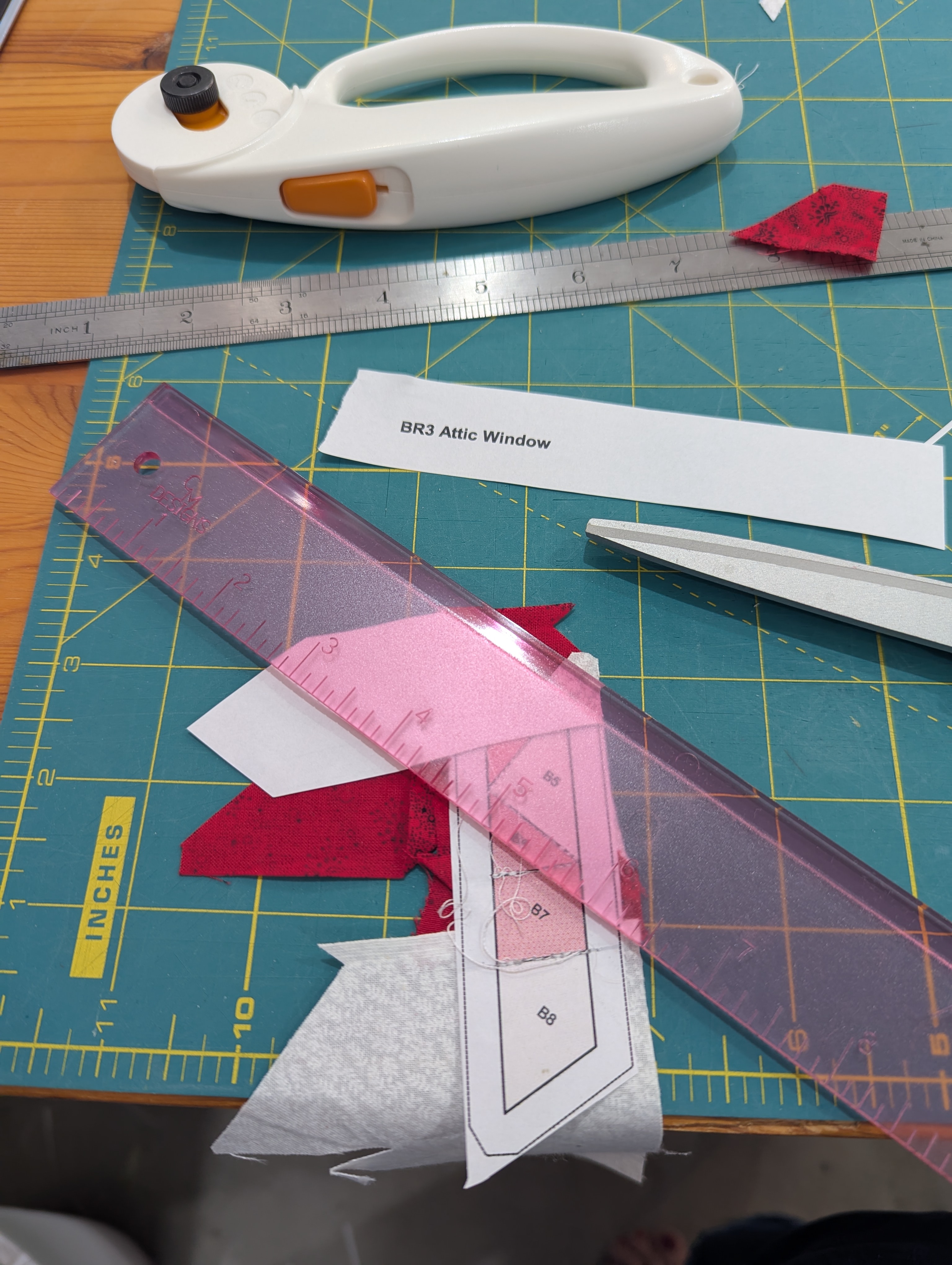 My latest purchase is an “add-a-quarter” ruler, and this one is 12″ long. Unlike the 6″ “add-a-quarter-plus” ruler, which I have misplaced, this one is full thickness and much heavier. It’s great for cutting the quarter-inch seam allowance, but useless to fold back the paper. I’m finding my metal ruler works well for this, though I dislike having to change tools. I have a replacement 6″ ruler on order, and look forward to its arrival.