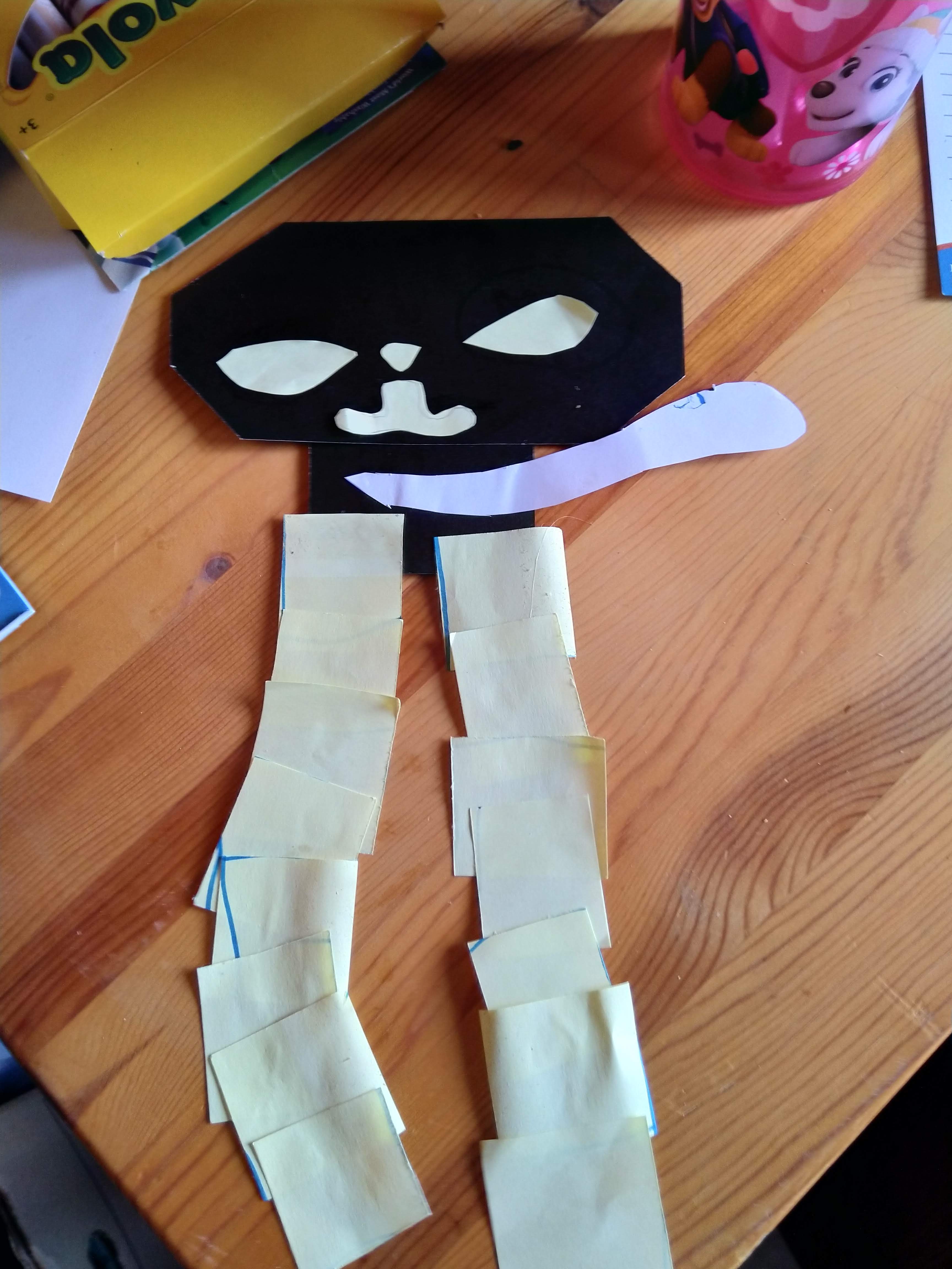 Among his afternoon activities was a visit to my desk (while I was in the other room) where he found my Cricut paper cutter (which he has seen me use, and shouldn’t have accessed without permission….) and offcuts of cardstock. He also asked for post-its, which I gave to him to use to create labels. Instead of making labels he drew lines, and then cut along the lines, to create four squares out of each larger post-it note. He cut triangles off the corners of a rectangle, and began gluing pieces together. When he needed eyes, nose, and mouth, he drew these on a post-it, and then came to me to ask for assistance to cut them out. The tail required a larger piece of paper, but again he drew and I cut. You can see the results at the top of this post.